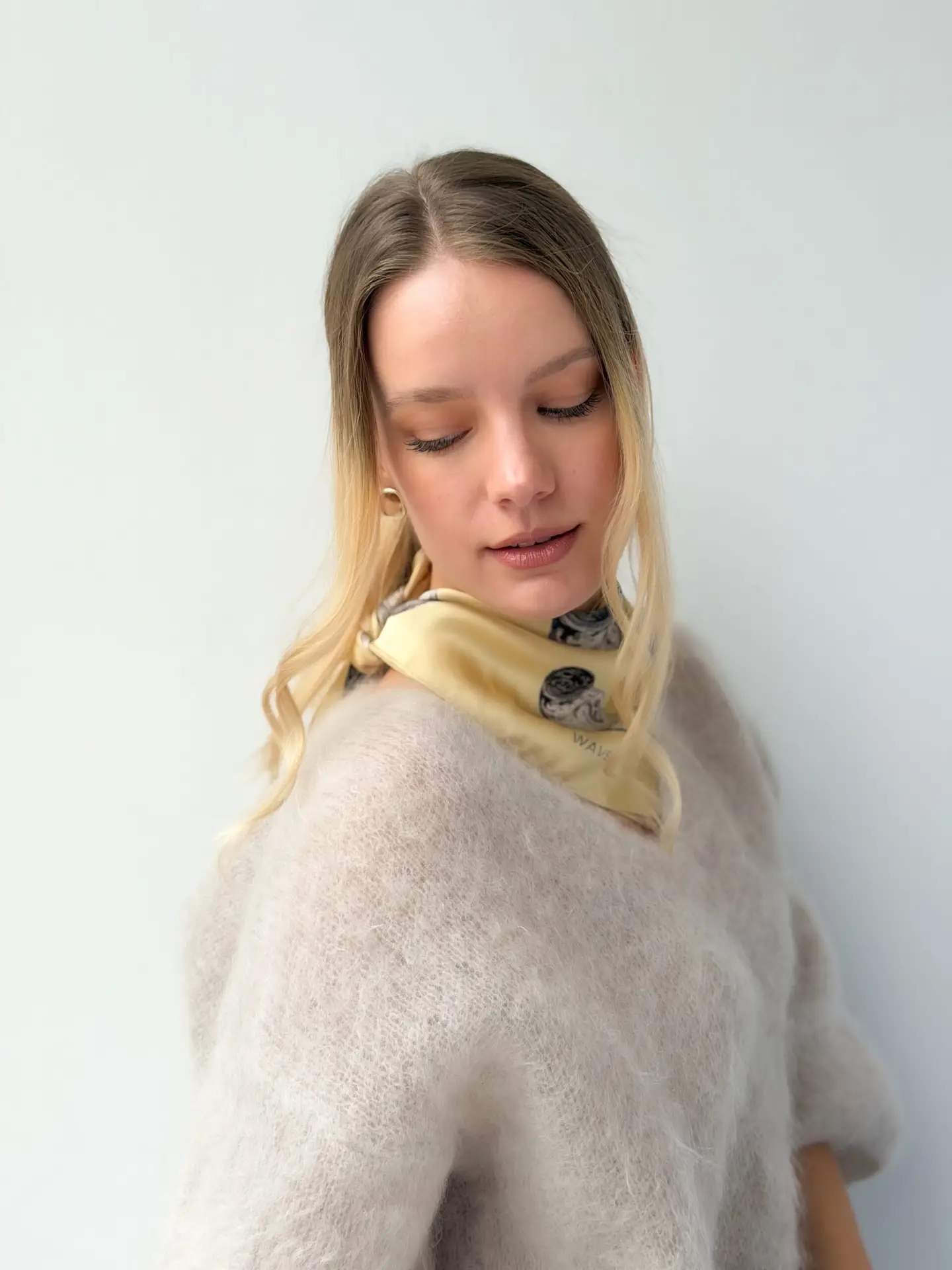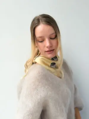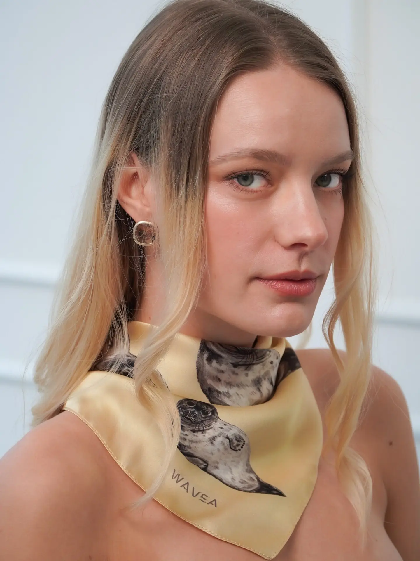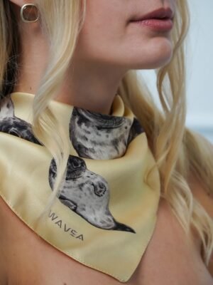 Jedwabna apaszka o wymiarach 55 × 55 cm przedstawiająca fokę szarą na tle ciepłego, maślanego odcienia żółci, inspirowanego kolorem nadbałtyckiego piasku.
